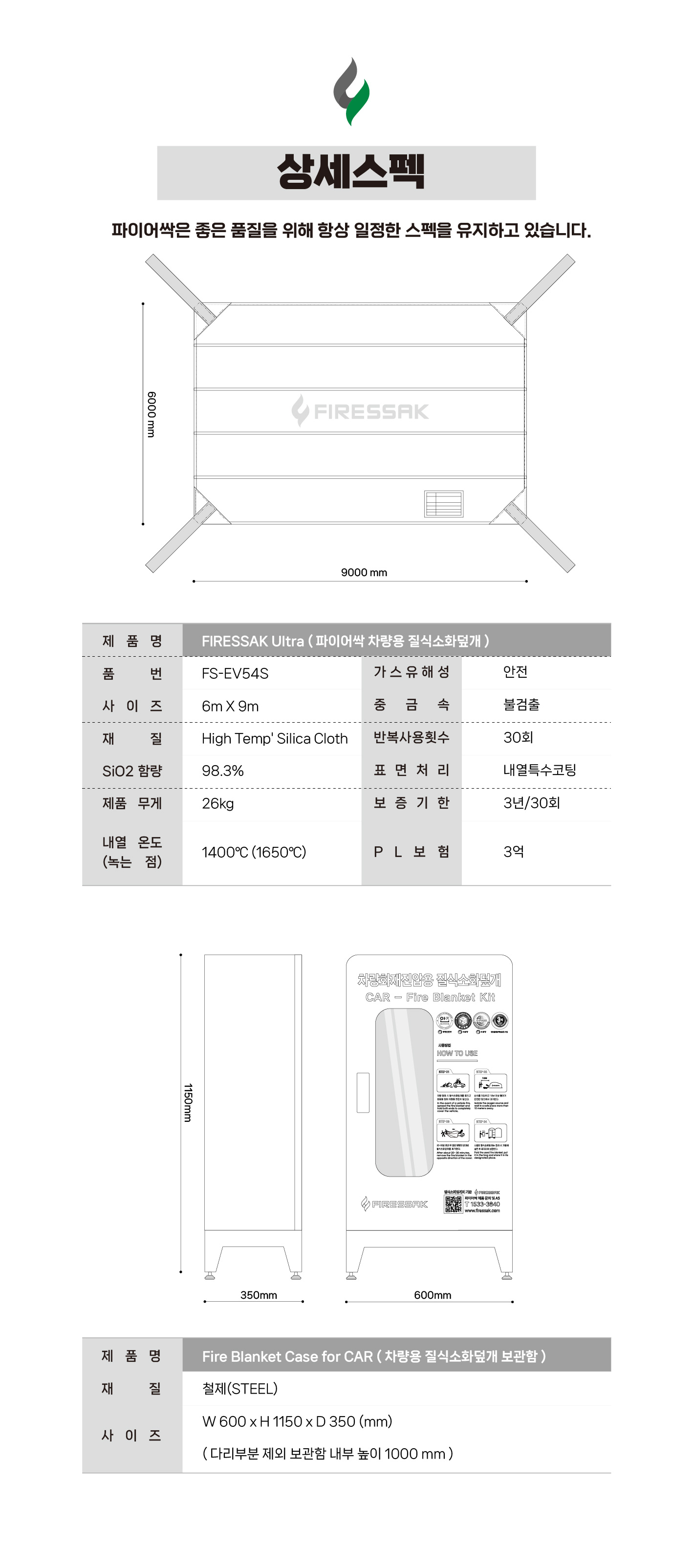 파이어싹 차량용 질식소화덮개 + 보관함 세트 상품 페이지입니다.